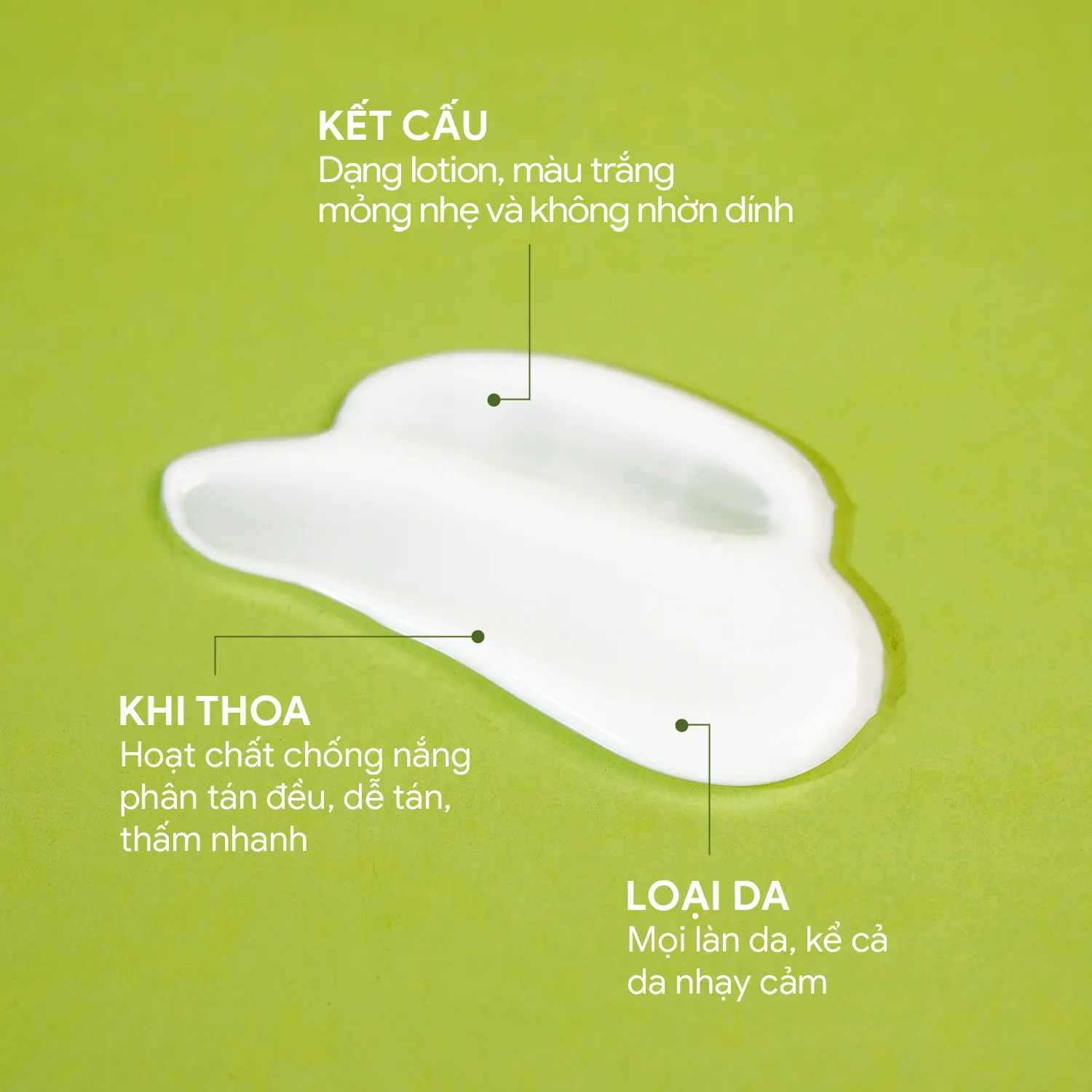 Nhờ Titanium Dioxide dạng bọc kích thước siêu nhỏ, sản phẩm có khả năng chống tia UVA1 và UVB tích cực, đồng thời kháng nước tốt mà vẫn nhẹ dịu, ít gây kích ứng. Khi thoa kem chống nắng lên da để lại hiệu ứng nâng tone nhẹ nhàng, không gây trắng bệch, giúp làn da sáng mịn và hài hòa tự nhiên.