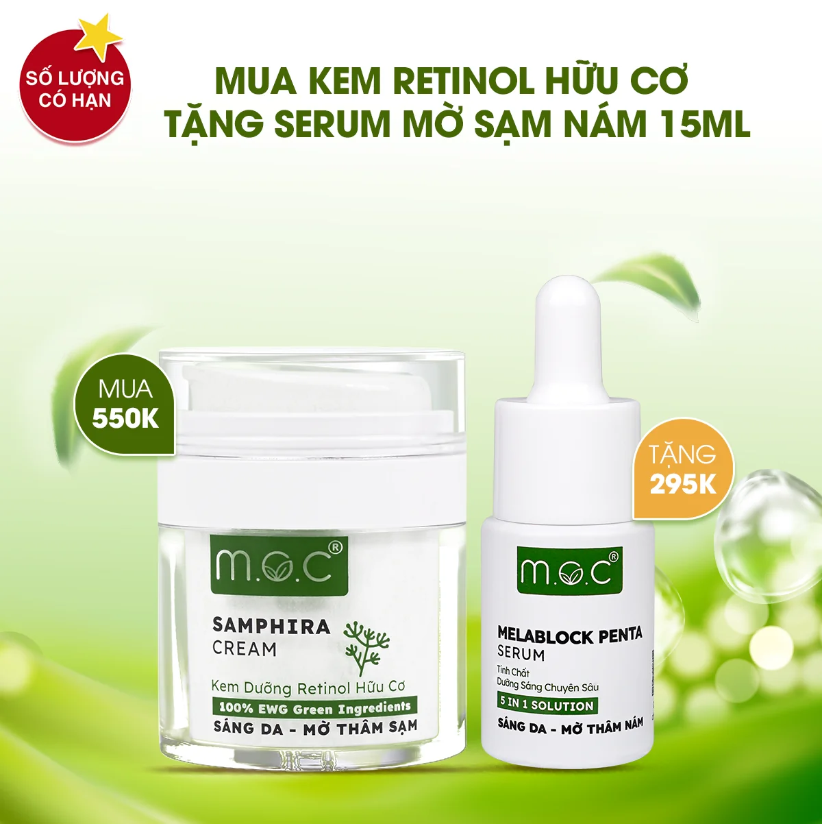 Sự hiệp lực chặt chẽ theo khoa học làn da của vô số thành phần quý giúp nâng tầm hiệu quả Kem Dưỡng Retinol hữu cơ M.O.C. Đảm bảo cải thiện phần lớn các vấn đề da phổ biến, và thay mới làn da toàn diện: MỀM MỊN – TRẮNG SÁNG – ĐỀU MÀU – MỜ NẾP NHĂN – GIẢM MỤN THÂM.