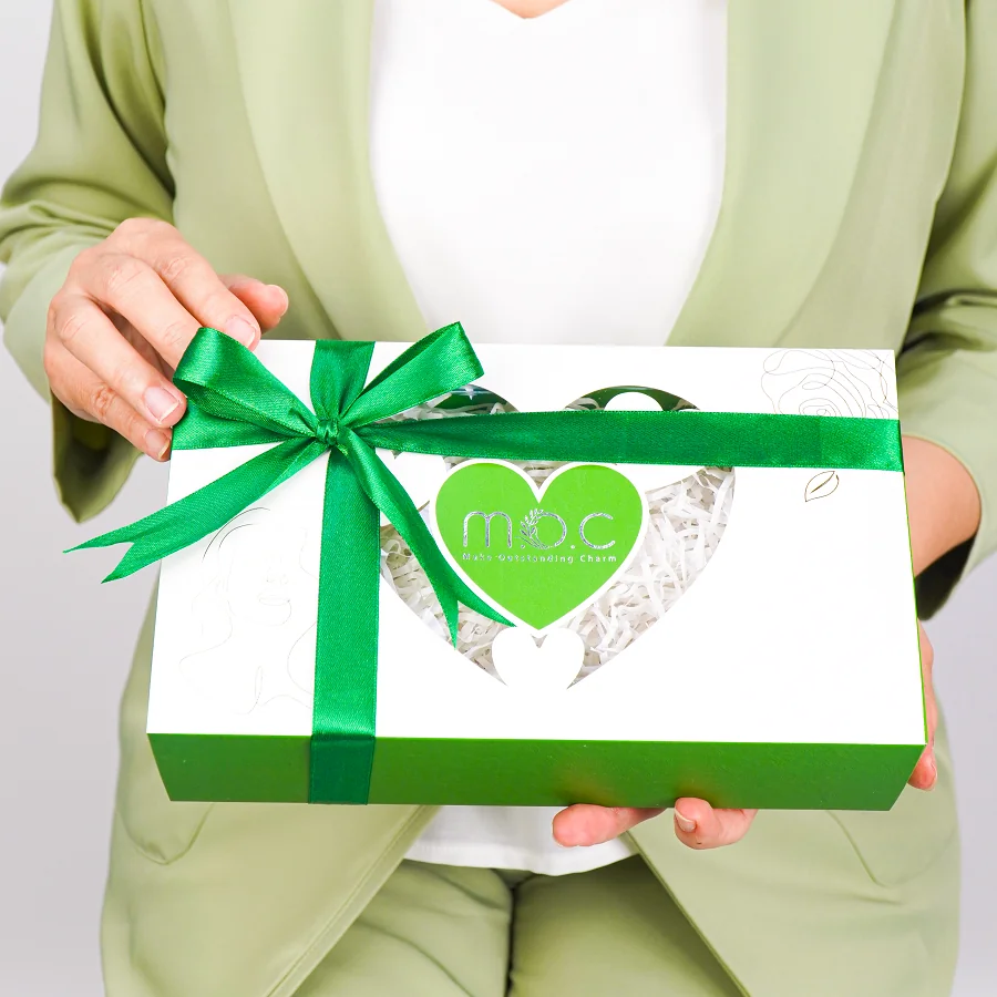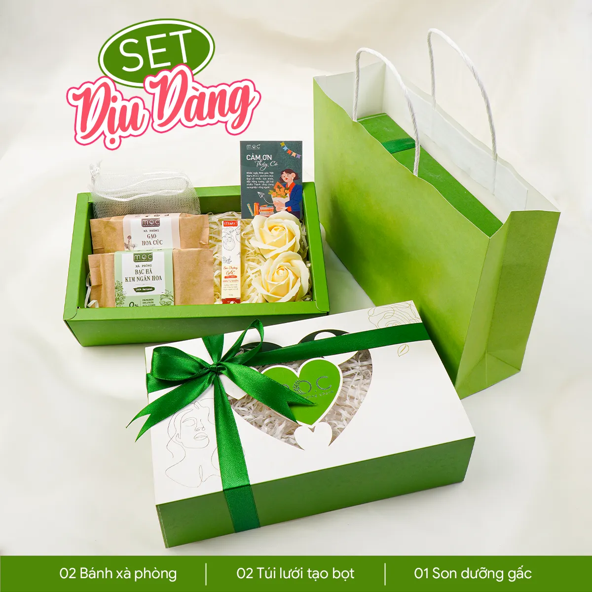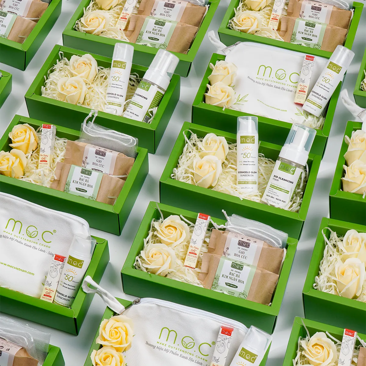 Mỗi set quà được M.O.C hoàn thiện chỉn chu với hộp quà sang trọng, túi giấy ton-sur-ton, kèm các chi tiết trang trí như hình ảnh cung cấp. Bạn có thể tự viết lời nhắn hoặc để M.O.C viết thay đôi dòng gửi gắm yêu thương.