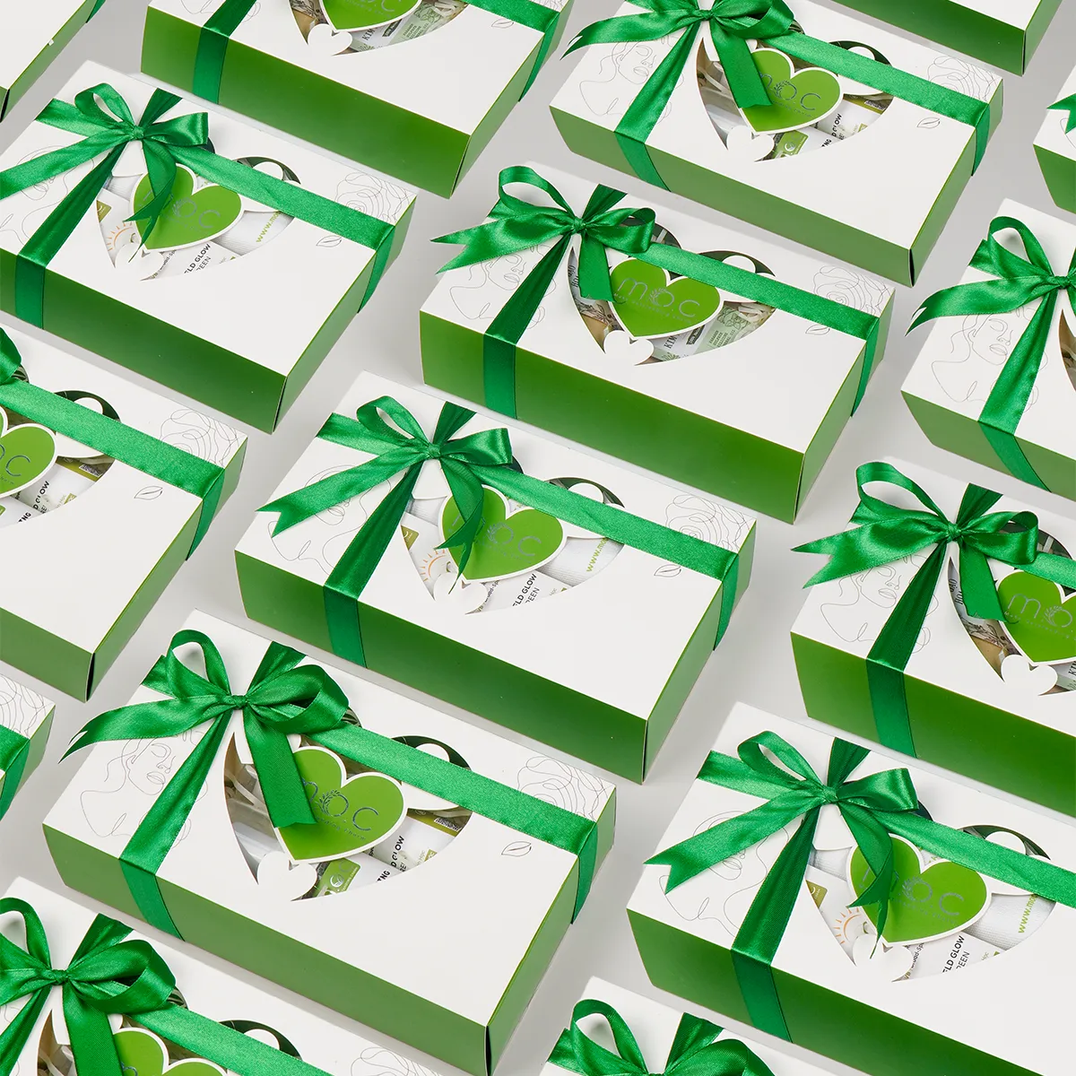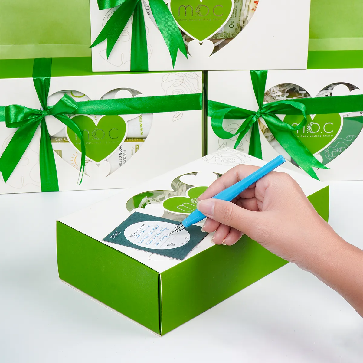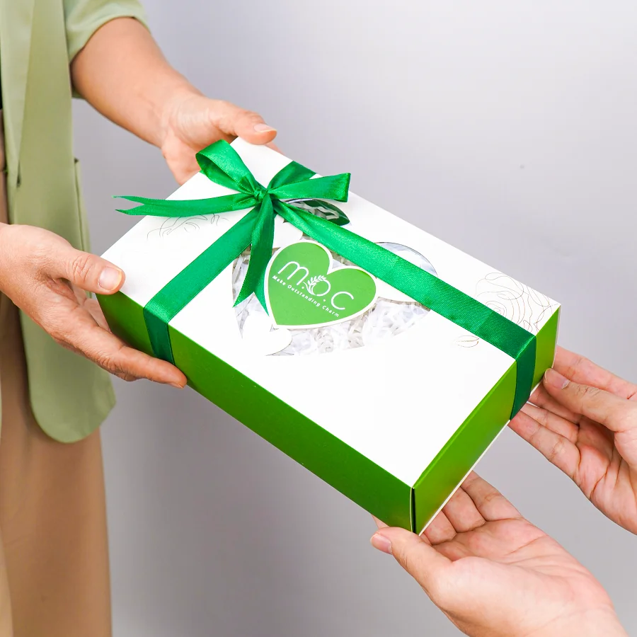 Mỗi set quà được M.O.C hoàn thiện chỉn chu với hộp quà sang trọng, túi giấy ton-sur-ton, kèm các chi tiết trang trí như hình ảnh cung cấp. Bạn có thể tự viết lời nhắn hoặc để M.O.C viết thay đôi dòng gửi gắm yêu thương.