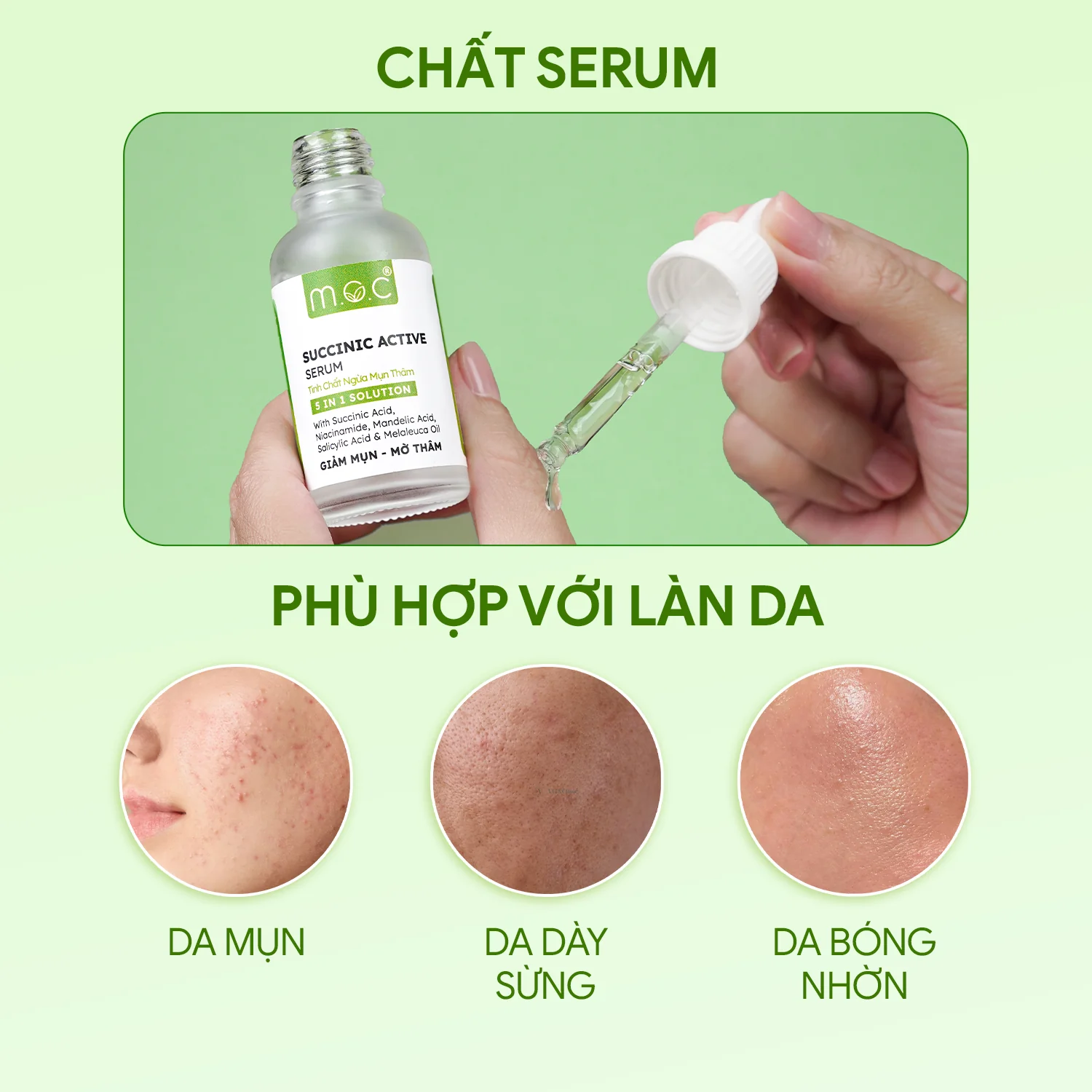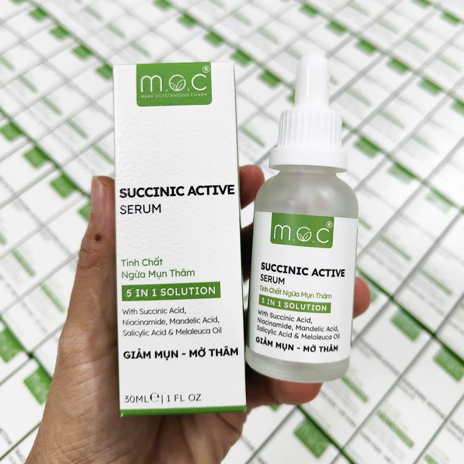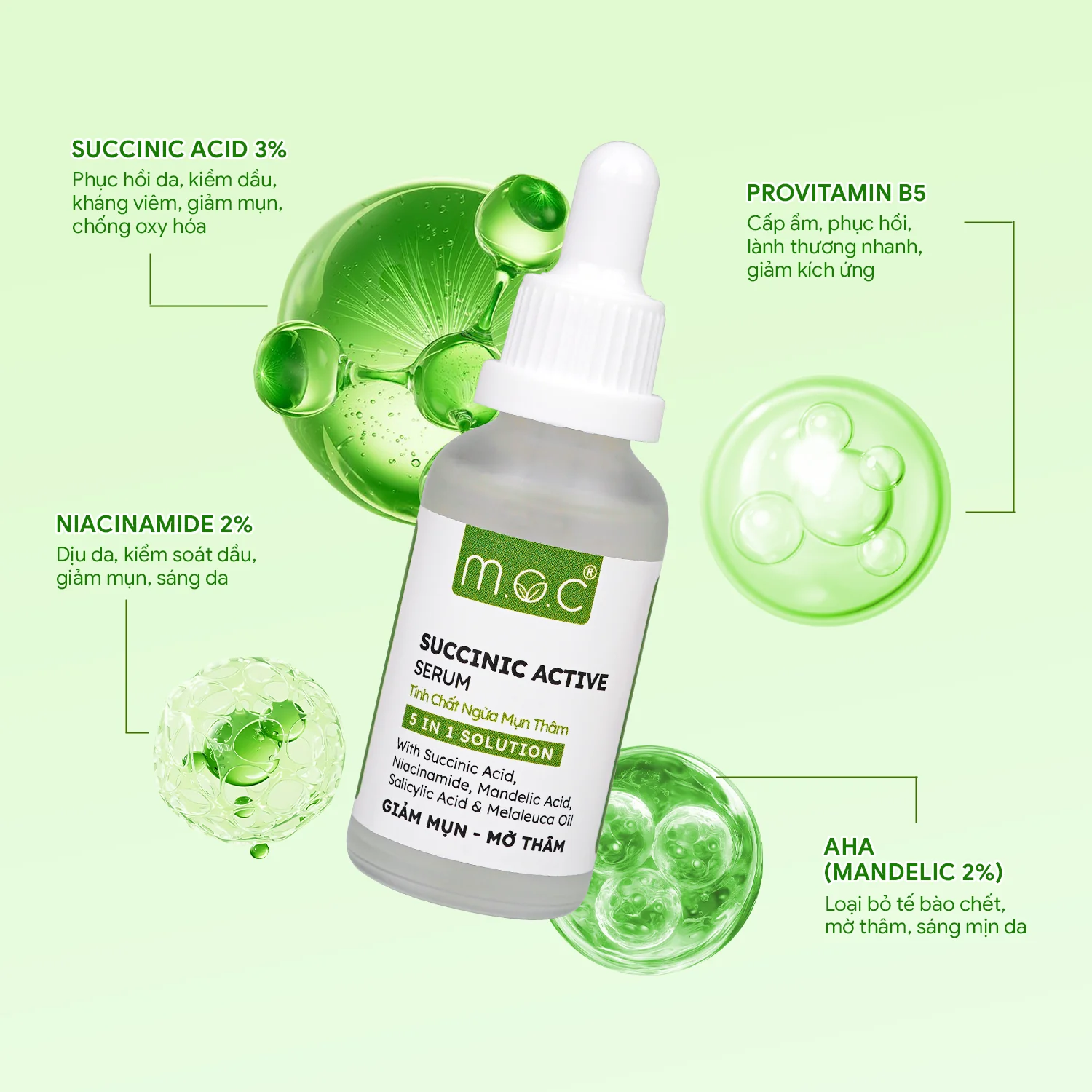 Bên cạnh Succinic Acid, công thức Serum M.O.C còn chứa Niacinamide 2%, AHA – Mandelic Acid 2% và BHA – Salicylic Acid 0.5%, tạo nên một tỷ lệ cân bằng giúp làm mờ thâm, sáng da, cải thiện độ đều màu và giảm bóng nhờn hiệu quả. Sự kết hợp này còn giúp lỗ chân lông thông thoáng, hạn chế mụn mới hình thành, đồng thời thúc đẩy tổng hợp ceramide và acid béo — củng cố hàng rào bảo vệ da, tăng sức khỏe và độ bền vững của làn da.